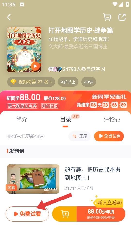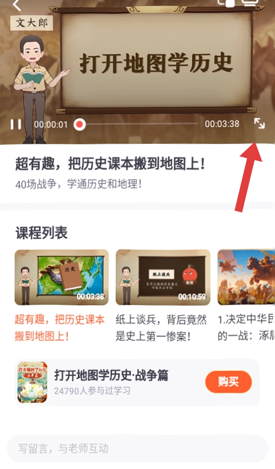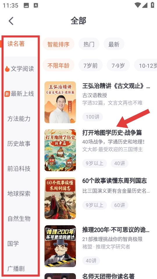 在分类页面先选定想学习的课程类别,接着从中挑选感兴趣的课程,比如选择【打开地图学历史·战争篇】并点击进入该课程的详情页面。