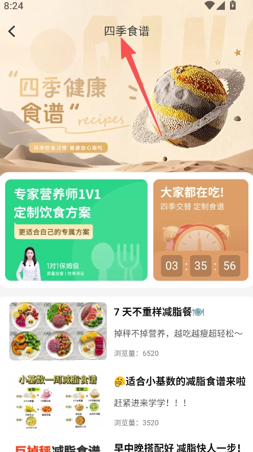 以健康饮食为核心,打造四季食谱主板块,提供专家一对一专属定制方案,精准覆盖四季更迭中的饮食需求,完美适配健康减脂的饮食规划场景。