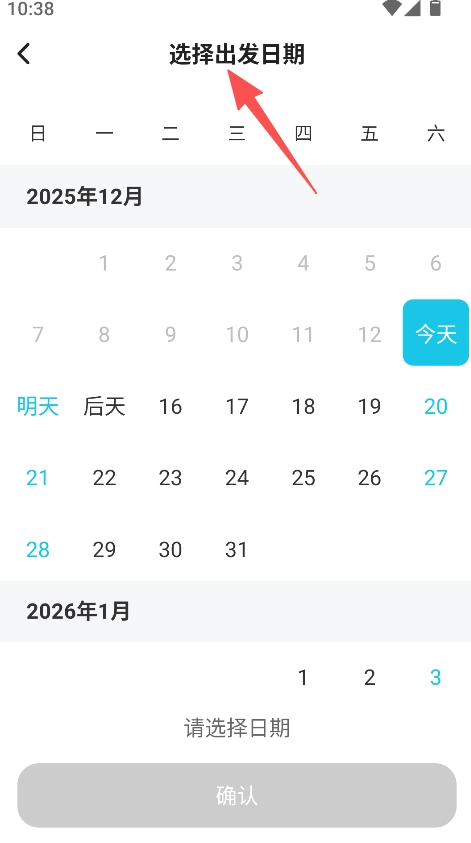 打开软件进入选择出发日期页面,选定目标日期。