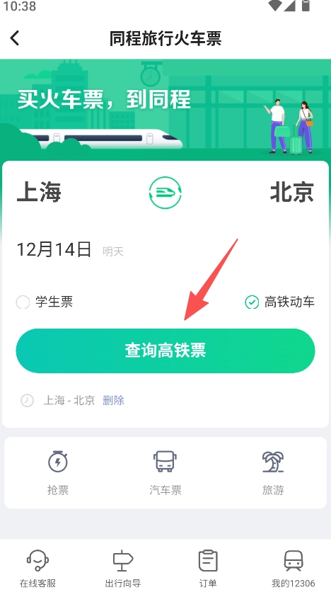 先选定出发和到达的城市,接着勾选高铁动车这一车次类型,之后点击查询按钮来查找高铁票。