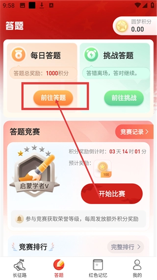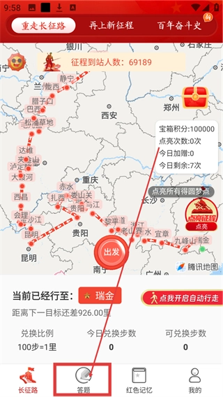 在【重走长征路】的主界面里,点击底部的【答题】按钮,即可进入答题页面,参与答题活动来赢取积分。
