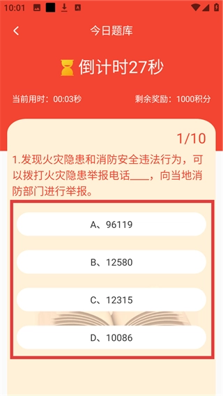 进入【今日题库】后,你会看到限时题目,只要选择正确选项完成答题,就能积累积分并获取奖励哦。