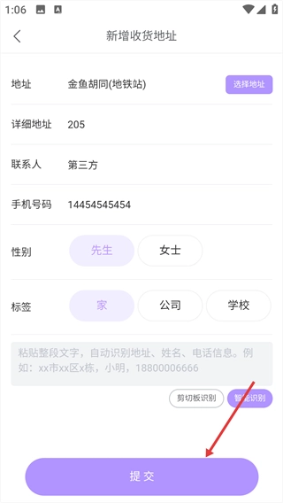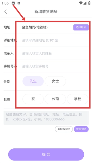 在完成信息填写后,点击页面底部的【提交】按钮,即可完成该收货地址的保存流程。