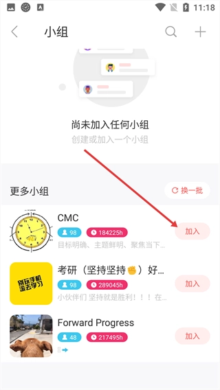 在小组页面的【更多小组】区域,找到目标小组后点击其旁边的【加入】按钮。