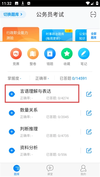 在当前题库页面找到【言语理解与表达】板块,点击该板块对应的区域,就能展开它的细分练习板块。