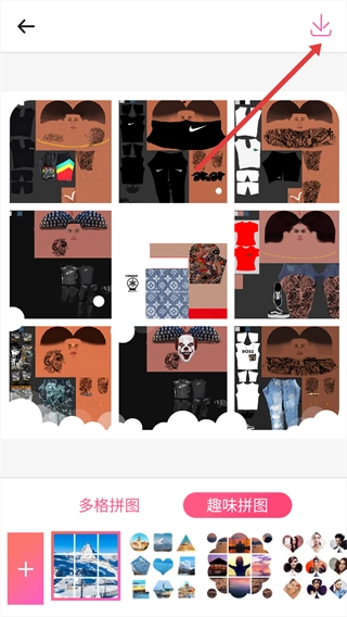 拼图完成后,在结果页面点击右上角的【】按钮,就能把拼接好的图片保存到手机里了。