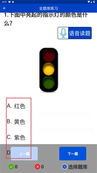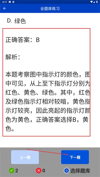 在答题页面,浏览题目(例如交通信号灯颜色相关题目)后,挑选对应的选项来完成回答。