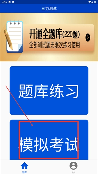 在“三力测试”的主界面中,点击【模拟考试】按钮,即可进入模考记录页面。