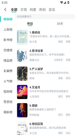 设有小说排行榜,展示不同小说人气,助于发现热门作品。