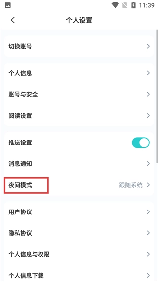 进入【个人设置】页面后,点击【夜间模式】选项,就能进入夜间模式的设置界面。