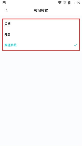 进入【夜间模式】设置页面后,你可以在【关闭】【开启】【跟随系统】这三种状态中进行选择,根据自己的需求切换状态,从而调整阅读时的界面显示模式。