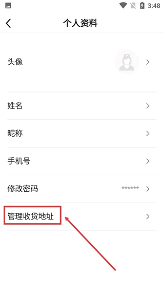 进入【个人资料】页面后,找到【管理收货地址】选项。
