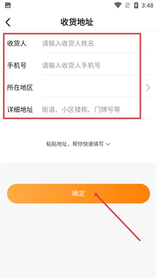 进入收货地址页面后,填写收货人、手机号等信息,完成后点击确定按钮就能保存地址了。