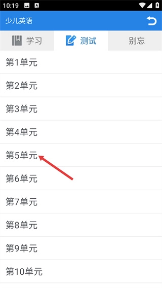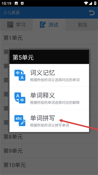 进入少儿英语页面后,点击顶部的【测试】标签,切换到测试模式,就能选择单元开展词汇测试。