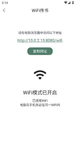 若选择【从电脑上传】,需确保手机与电脑连接至同一WiFi网络,随后在电脑端打开页面显示的地址,进入对应网页即可完成传书操作。