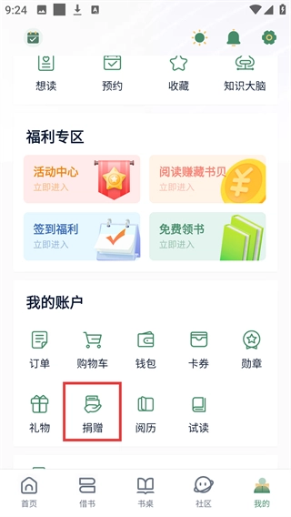 进入【我的】页面后,在【我的账户】板块里找到【捐赠】选项并点击,就能进入捐赠相关页面。