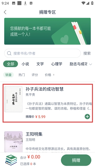 在【捐赠专区】里,您可以通过搜索功能查找书籍,或者按照分类筛选书籍;选定想要捐赠的书籍后,点击【捐赠】按钮,就能完成书籍捐赠的操作。