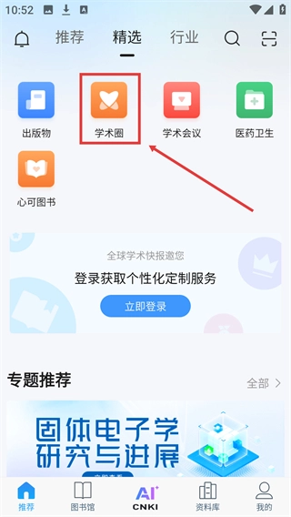 学术圈的位置,移动到推荐-精选,导航功能栏中