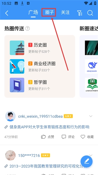 进入【学术圈】页面后,点击顶部的【圈子】标签,就能切换到圈子列表页面,查看热圈传送等相关内容。