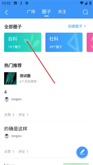 进入【圈子】页面后,点击【自科】分类按钮,该分类下有19个圈子,可查看对应圈子的内容。