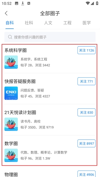 进入【全部圈子-自科】页面后,能看到【系统科学圈】等圈子,页面上会展示各圈子的帖子数量、浏览量以及关注按钮。