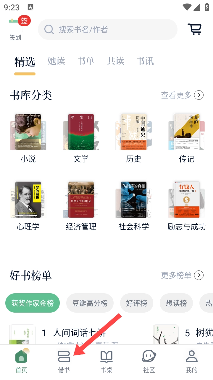 打开藏书馆应用后,找到底部导航栏上的【借书】图标并点击,即可进入借书界面。