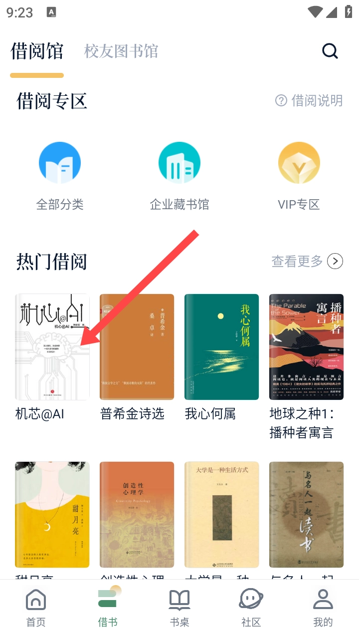 在【借书】界面的【热门借阅】板块中,找到你想要借阅的【书籍】并点击它。