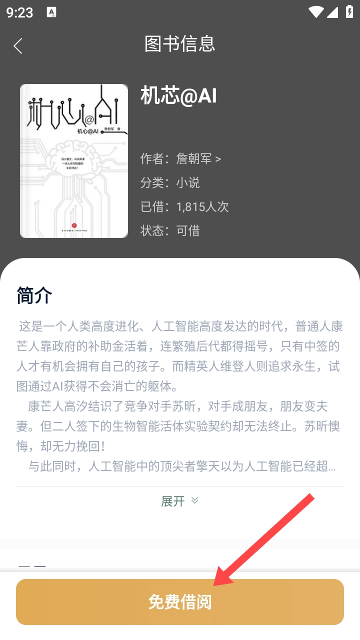 进入【图书信息】页面后,点击底部的【免费借阅】按钮即可完成借书操作。