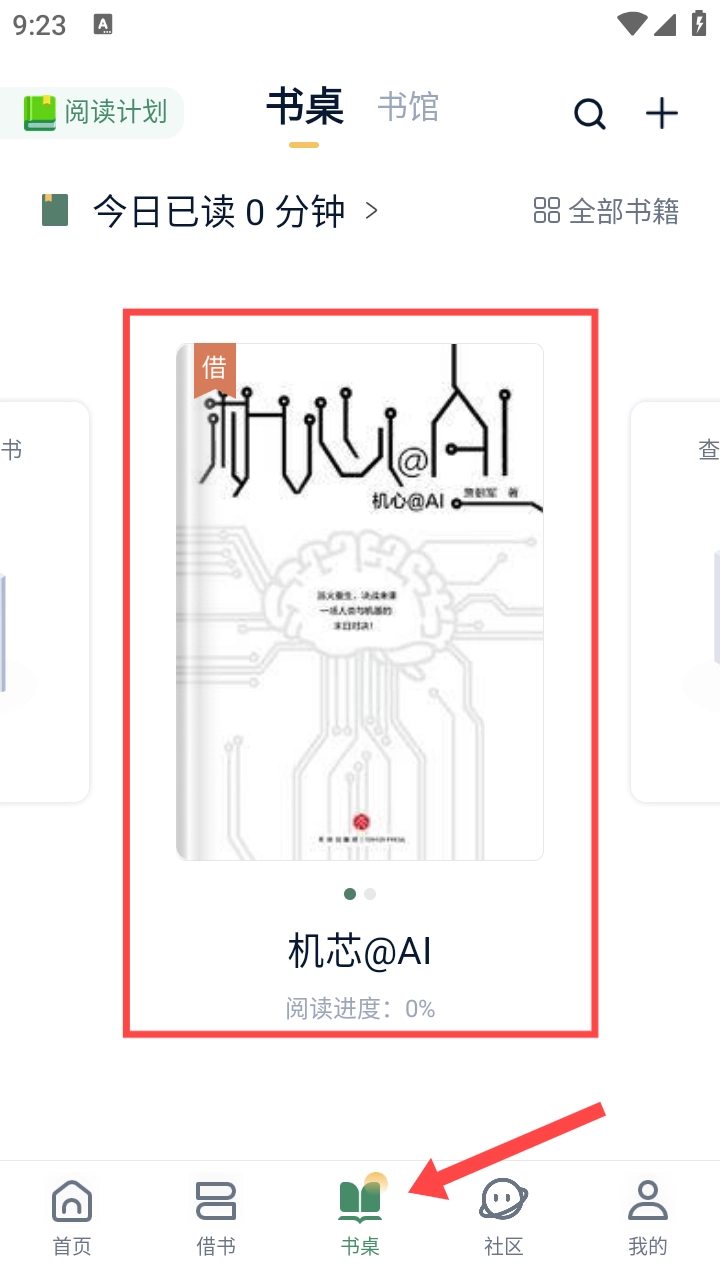 借完书后,点击底部的【书桌】图标,就能在书桌页面查看已经借到的【书籍】了。