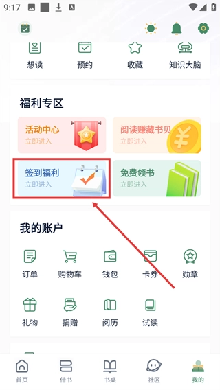 进入【我的】页面后,在【福利专区】板块中找到【签到福利】选项并点击,即可参与签到活动。