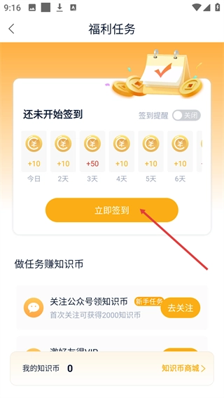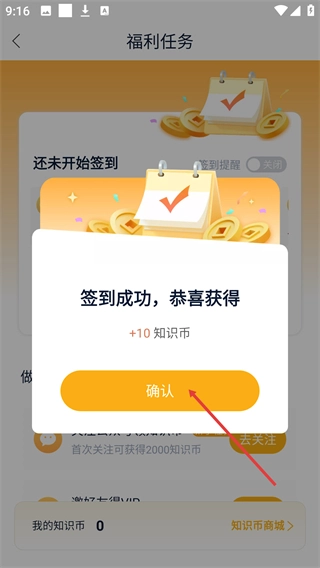 点击【立即签到】按钮后,系统会弹出【签到成功-恭喜获得+10知识币】的提示框,点击【确认】按钮就能完成整个签到流程。