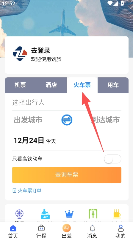 打开软件,进入首页后点击火车票选项,切换到对应的服务页面。