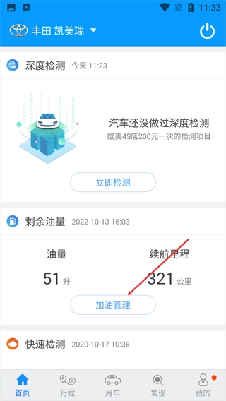 进入首页后,找到“剩余油量”板块,点击其中的【加油管理】按钮。