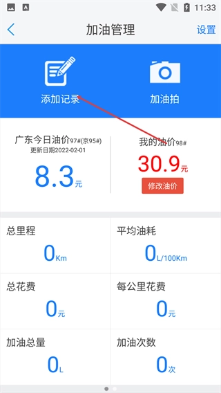 在加油管理页面,点击顶部的【添加记录】按钮。