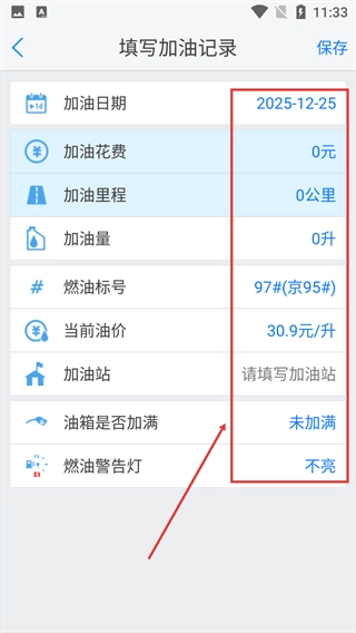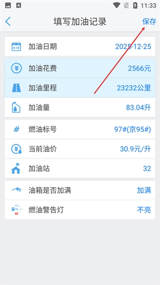 在确认所有信息都已填写完毕后,点击页面右上角的【保存】按钮,就能完成这次加油记录的添加操作。
