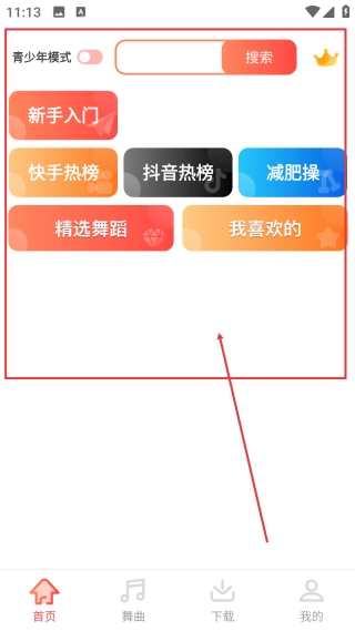 进入首页后,你可以【切换青少年模式,借助搜索框查找所需内容】,还能选择新手入门之类的分类。