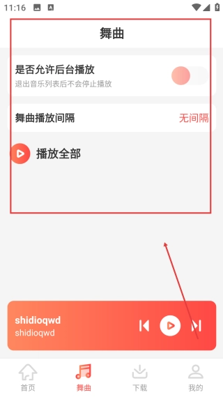 进入舞曲页面后,你可以进行【后台播放权限的设置以及播放间隔的调整】,点击“播放全部”即可播放所有舞曲。