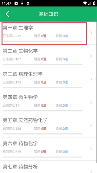 在【基础知识】页面,找到【第一章-生理学】这一章节,点击该章节就能进入对应的练习页面。