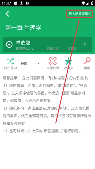 在【第一章-生理学】页面中,点击右上角的【进入新答题模式】按钮,就能切换到新的答题模式开展练习。