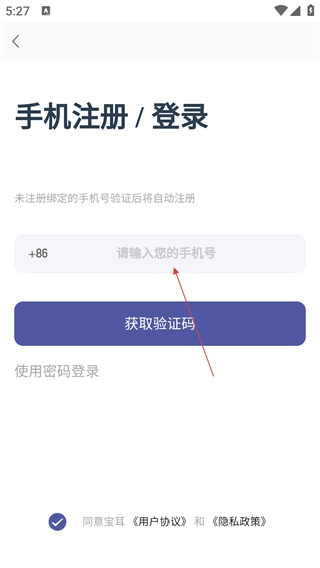 在【手机注册/登录】页面,填写手机号,勾选相关协议后,点击【获取验证码】按钮。