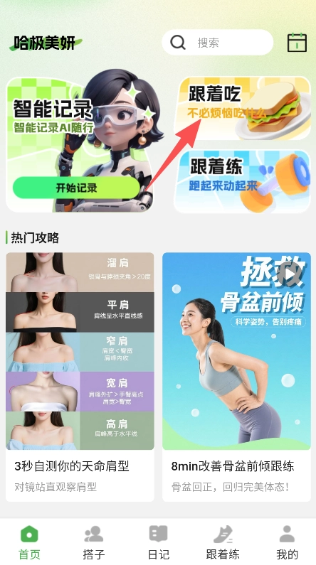 含热门攻略板块,呈现肩型自测骨盆前倾跟练等内容,搭配对应饮食运动的美体减脂指导方向。