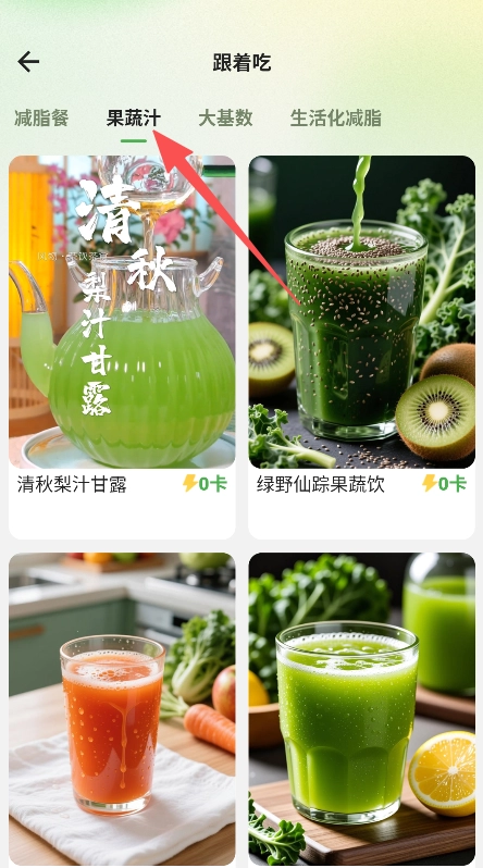 提供板块切换功能,点击跟着吃进入对应页面,选择减脂餐果蔬汁等分类浏览对应的减脂食谱。