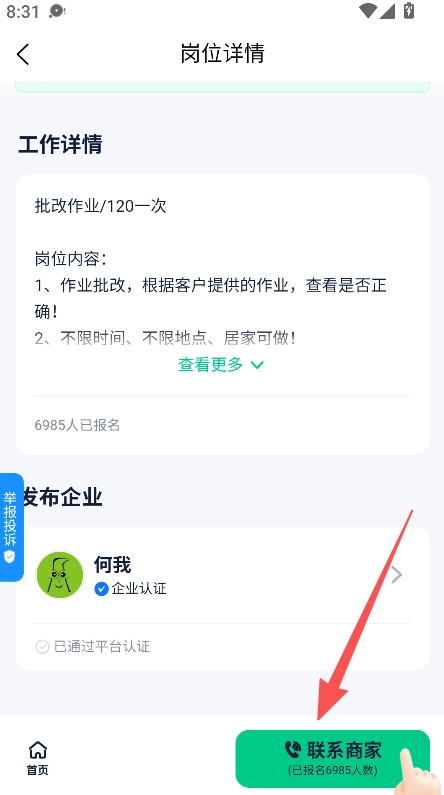 该平台设有报名联系功能,用户在岗位详情页面点击“联系商家”按钮,即可开展兼职岗位的报名相关操作。