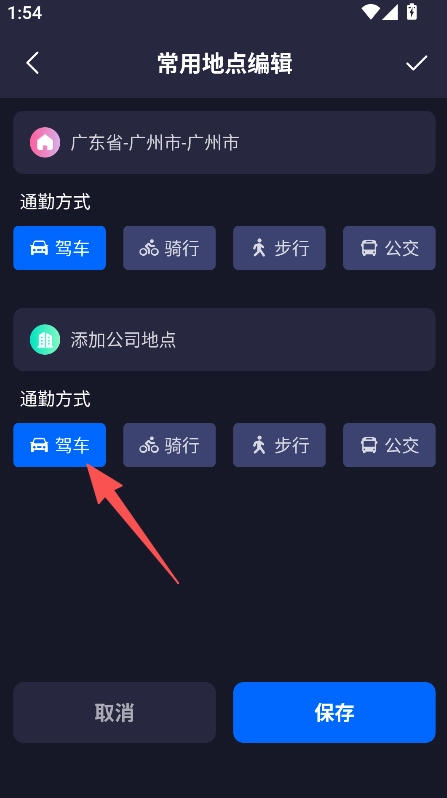 进入常用地点编辑页选择所需的通勤方式。