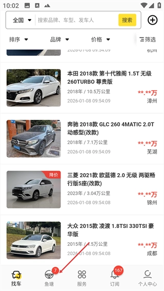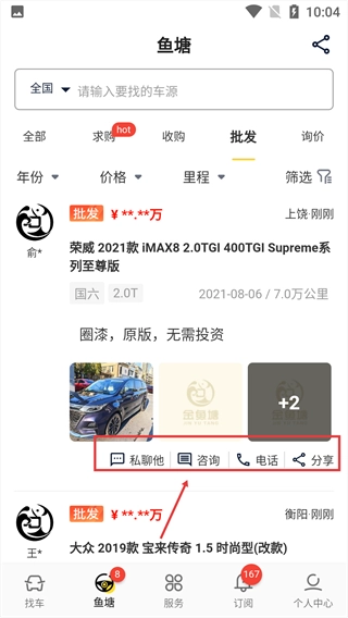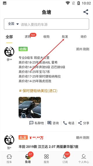 进入鱼塘页面后,点击【批发】标签,就能切换到批发类车源列表。