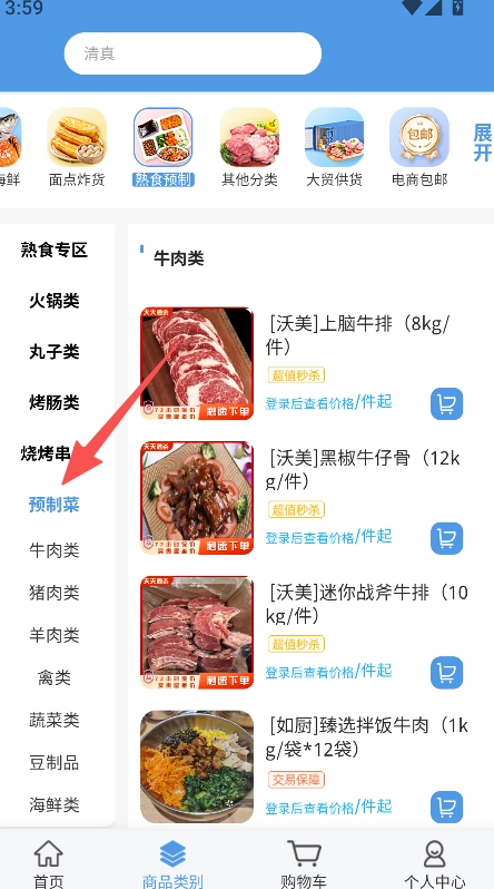 商品类别已细分到熟食、火锅、预制菜等类别,覆盖多种冷冻食品品类,进一步细化了商品查找的维度。
