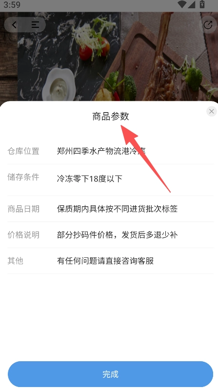 展示商品参数,涵盖仓库储存条件等内容,以此拓宽对冷冻食品信息的了解维度,并加深其内容深度。