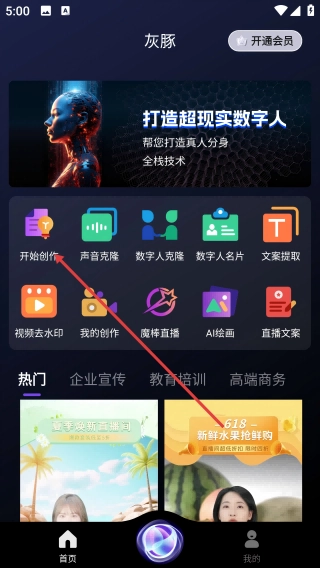 打开灰豚后,在首页找到并点击【开始创作】按钮,即可进入数字人创作的流程。