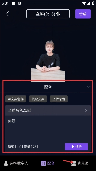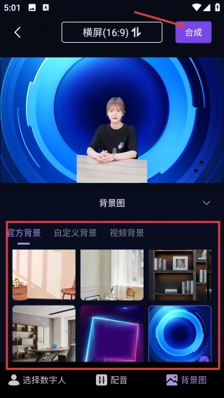 切换到【背景图】页面,挑选心仪的背景(比如带有科技感的背景样式),最后点击【合成】按钮,即可完成数字人内容的创作。