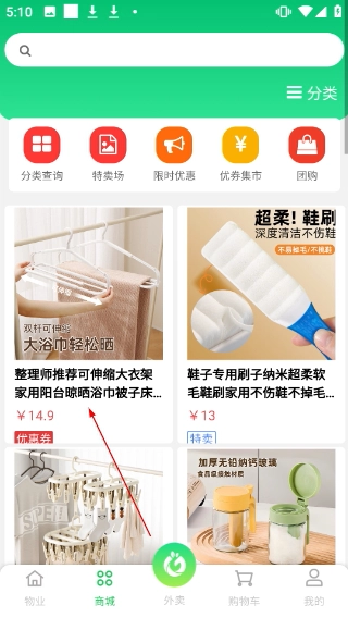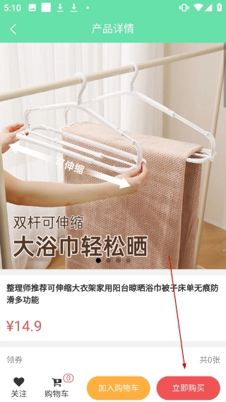 在商城页面点击名为【双杆可伸缩大浴巾轻松晒】的衣架商品,即可进入该产品的详情页面。